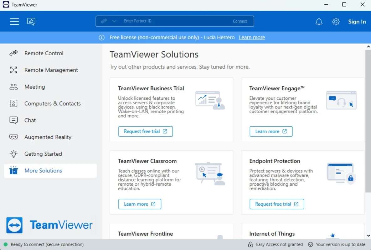 TeamViewer es uno de los programas más populares a nivel mundial que ofrece conexiones rápidas y fiables, independientemente de la ubicación, el dispositivo y el sistema operativo. Es un software útil tanto para uso personal como comercial. Los planes de suscripción están disponibles en tres categorías: